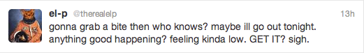 With that in mind, let’s bring it back to the present day. With promises of a “very special guest” from Gaslamp Killer and Daddy Kev, knowing full well that it would most likely be a Coachella holdover, as well as a scheduled performance from The Grouch and Eligh, the decision to trek to Lincoln Heights for Low End Theory last night was an easy one. After stellar opening sets from every resident (including a fair share of our man Baauer), and a sub-par half hour via Taurus Scott, Grouch and Eligh took the stage and ripped through tracks from No More Greener Grasses and Say G&E!. I should have seen it coming, knowing that Company Flow was/will be at Coachella, but halfway through the set (which also included an appearance from Luckyiam), someone shouted out that El-P was in the building.