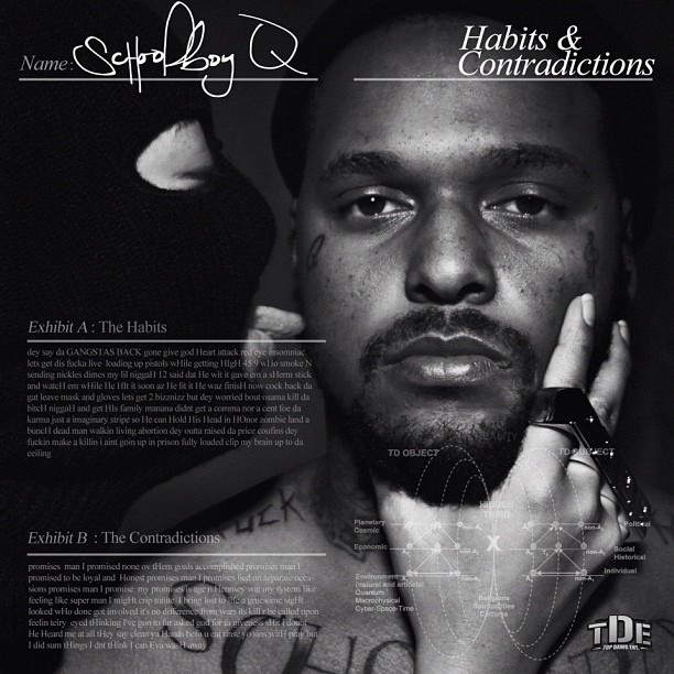 Now that the Black Hippy name is out there, the question is whether they have the staying power to truly become the next big thing in West Coast hip-hop. With Habits & Contradictions, Schoolboy Q has answered that question with a resounding yes. Schoolboy’s follow up to his first album, Setbacks, was released at midnight on January 14 and is easily the best hip-hop release at this point in the year. Featuring guest appearances from Q’s Black Hippy cohort, A$AP Rocky, Dom Kennedy and Curren$y, and production from Alchemist, Lex Luger and A$AP Ty, there is plenty of talent surrounding the Carson City MC. Some MC’s might be overwhelmed when surrounded by so many talented MC’s/producers, but Schoolboy still manages to own the project.